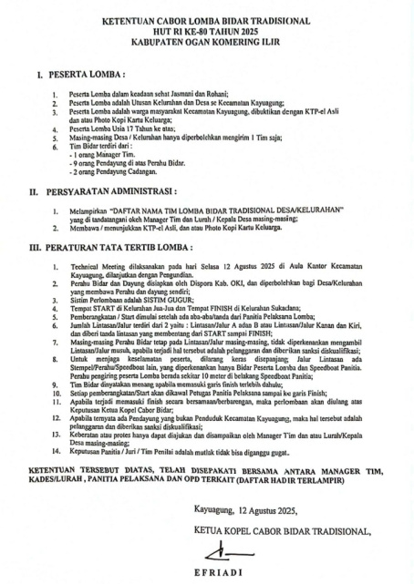 Halokantinews.com.OKI – Lomba Perahu Bidar dalam Rangka Memperingati Hari Kemerdekaan Republik Indonesia Ke-80 Tahun 2025 yang dilaksanakan di Sungai Komering Kayuagung kali ini berubah dari Ketentuan sebelumnya dan diduga Tidak Sesuai dengan Ketentuan Cabor Lomba Bidar Tradisional HUT RI KE-80 Tahun 2025 Kabupaten OKI yang di Tandatangani Efriadi selaku Ketua Kopel Cabor Bidar Tradisional tertanggal 12 Agustus 2025 beberapa waktu lalu.