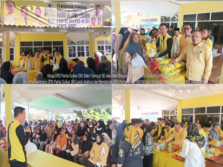 Halokantinews.com.OKI – Hari ini kita Dewan Pimpinan Daerah (DPD) Partai Golkar Kabupaten OKI mengadakan kegiatan sembako murah sebanyak 1000 (seribu) paket sembako kepada masyarakat Kayuagung dan sekitarnya. Kegiatan ini sebagai bentuk kepedulian Partai Golkar kepada masyarakat ditengah kondisi perekonomian saat ini. Kegiatan ini dilaksanakan dalam rangka memperingati HUT Ke-61 Partai Golkar yang puncaknya nanti akan dilaksanakan pada tanggal 20 Oktober 2025 nanti, ujar Ketua DPD Partai Golkar Kabupaten OKI, Bakri Tarmuzi, SE saat membuka kegiatan pembagian sembako di Sekretariat DPD Partai Golkar OKI di Jalan Letnan Darna Jambi Nomor 78 Kelurahan Paku Kecamatan Kayuagung OKI, Sabtu (4/10/2025).