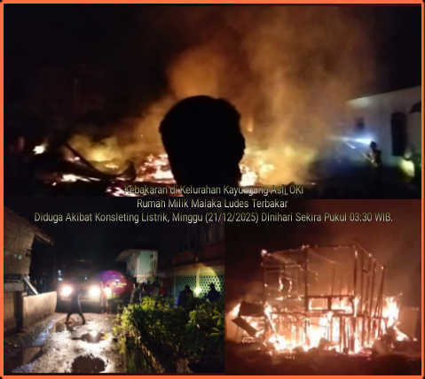 Halokantinews.com.OKI – Rumah Panggung Kayu lama berlantai 2 milik Pak Malaka (75) yang berada di LK.1 RT 01 Kelurahan Kayuagung kecamatan Kayuagung OKI ludes terbakar tanpa ada sedikitpun barang yang diselamatkan. Peristiwa tersebut terjadi sekitar pukul 03.30 WIB Minggu Dinihari (21/12/2025).