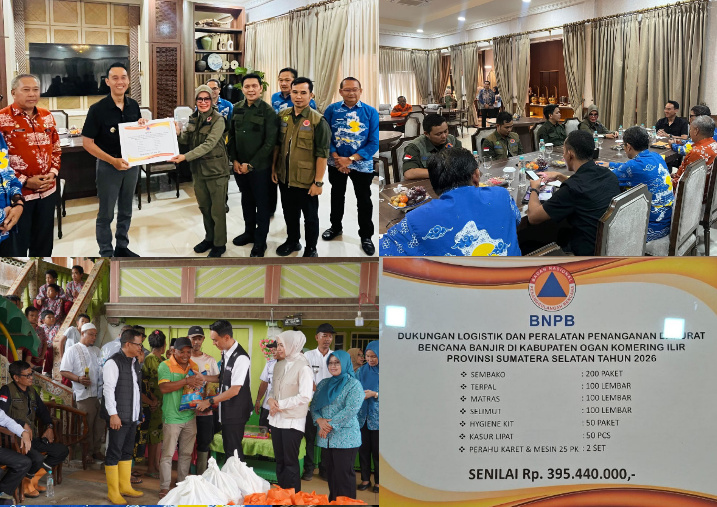 Halokantinews.com.OKI – Bupati Ogan Komering Ilir (OKI) Muchendi Mahzareki menerima kunjungan kerja sekaligus penyerahan bantuan dukungan logistik dan peralatan darurat dari Badan Nasional Penanggulangan Bencana (BNPB) Republik Indonesia (RI) di Pendopo Rumah Dinas Bupati OKI, Kamis (15/1/2026) sebagai langkah strategis percepatan penanganan bencana banjir di wilayah yang terdampak.