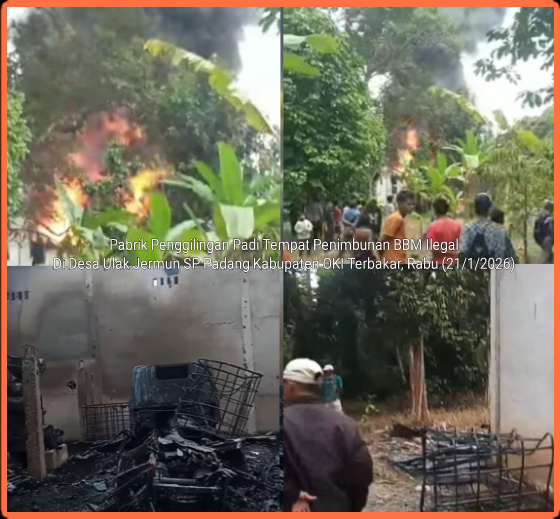 Halokantinews.com.OKI – Sebuah bangunan yang diduga tempat penggilingan padi yang diduga menjadi lokasi penimbunan Bahan Bakar Minyak (BBM) Ilegal di Desa Mangunjaya Kecamatan Sirah Pulau Padang, Kabupaten Ogan Komering Ilir (OKI) pada hari Rabu (21/1/2026) terbakar.