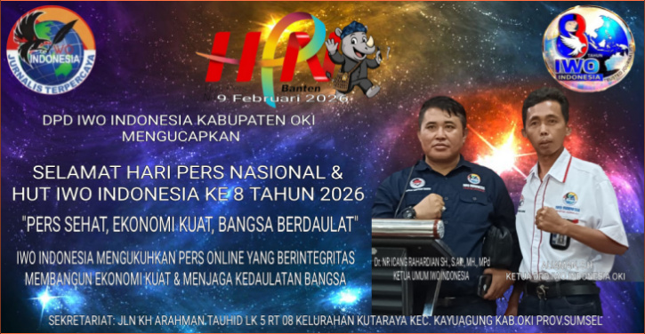 Halokantinews.com.OKI – Memperingati Hari Pers Nasional bersamaan dengan Hari Ulang Tahun (HUT) Organisasi Wartawan “Ikatan Wartawan Online Indonesia” (IWO Indonesia) ke 8 tahun di tanggal 9 Februari 2026. Untuk itu Ketua Dewan Pimpinan Daerah Ikatan Wartawan Online Indonesia (DPD IWO Indonesia) Kabupaten OKI, Aliaman, SH mengucapkan