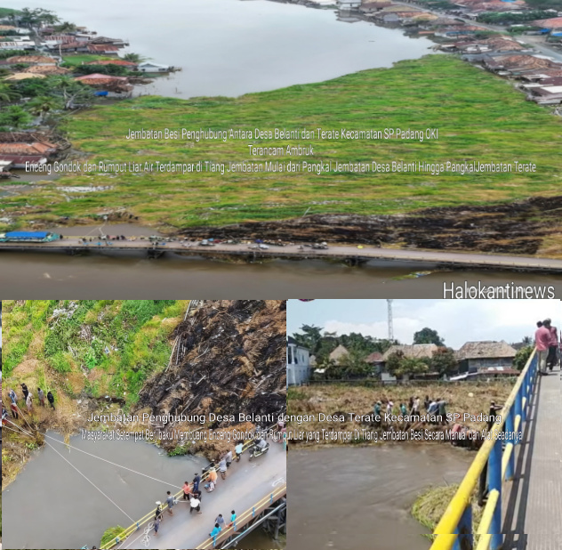 Halokantinews.com. OKI – Jembatan Penghubung Desa Belanti dan Desa Terate Kecamatan Sirah Pulau Padang yang berada di aliran Sungai Komering “Terancam Ambruk”. Pasalnya, Jembatan bertiang besi tersebut saat ini sedang dalam serangan pasukan Enceng Gondok dan rumput liar air ditengah debit Air Sungai Komering yang begitu deras. Apalagi Enceng Gondok dan rumput liar air memenuhi sungai bahkan dari pangkal Jembatan Desa Belanti dan Pangkal Jembatan Desa Terate.