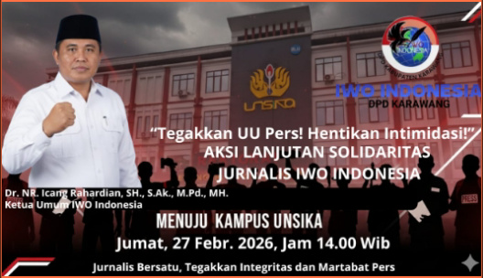 Dewan Pimpinan Pusat (DPP) Ikatan Wartawan Online Indonesia (IWOI) resmi mengeluarkan instruksi kepada seluruh jajaran pengurus dan anggota di Indonesia untuk menggelar Aksi Nasional Bela Jurnalis di depan Kampus Universitas Singaperbangsa Karawang (UNSIKA), Jumat, 27 Februari 2026, mulai pukul 14.00 WIB hingga selesai.