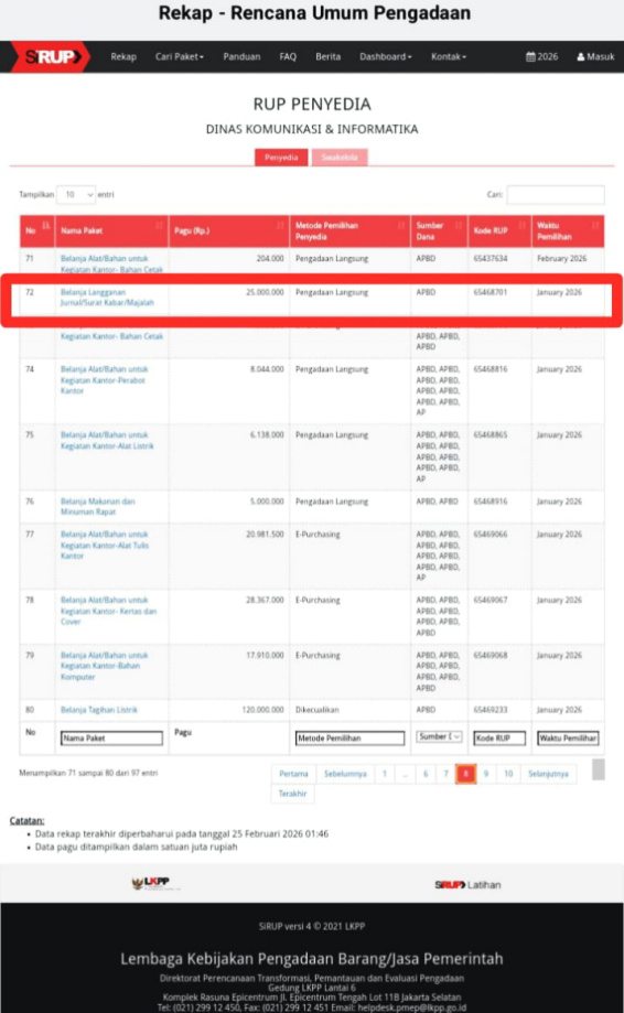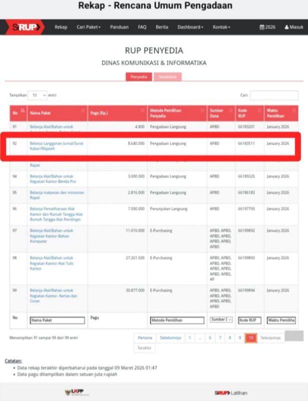 Hal tersebut berdasarkan informasi data rekap terakhir diperbaharui pada tanggal 25 Februari 2026 pukul 01:46 diketahui bahwa alokasi anggaran Belanja Langganan Jurnal/Surat Kabar/Majalah yang tercantum dalam rekap Sistem informasi rencana umum pengadaan (SiRUP) pada RUP Penyedia Dinas Komunikasi dan Informatika OKI sebesar Rp.25.000.000 pertahun dengan kode RUP 65468701 waktu pemilihan Januari 2026.