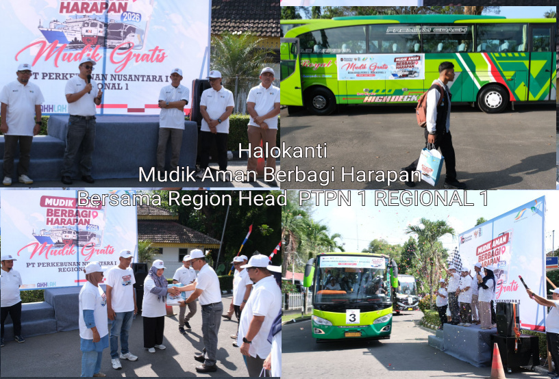 Halokantinews.com.TanjungMorawa.Sumut – Region Head PT Perkebunan Nusantara I Regional 1 Tanjung Morawa, Wispramono Budiman bersama Operation Head Ganda Wiatmaja melepas keberangkatan tiga unit bus mudik gratis bagi masyarakat dan keluarga besar PTPN yang akan pulang ke kampung halaman menjelang Hari Raya Idul Fitri, Selasa (17/3/2026).