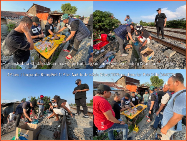 Halokantinews.com.Medan.Sumut – Satuan Reserse Narkoba (Satresnarkoba) Polrestabes Medan kembali menggerebek sarang narkoba di kawasan bantaran Rel Kereta Api (KA) Tembung, Kecamatan Percut Seituan. Dari Penggerebekan di 2 (dua) titik petugas meringkus 4 (empat) pelaku dan menyita barang bukti narkoba jenis Sabu-sabu seberat 10,59 gram diamankan, Sabtu (25/4/2026).